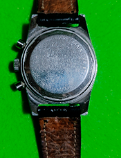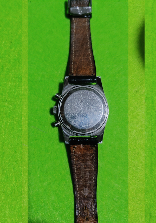 Características del Dial: Presenta una esfera negra con dos subesferas (bicompax) para las funciones del cronógrafo e índices con material luminiscente (tritio en modelos originales) que suelen adquirir un tono amarillento o "chocolate" con el tiempo.